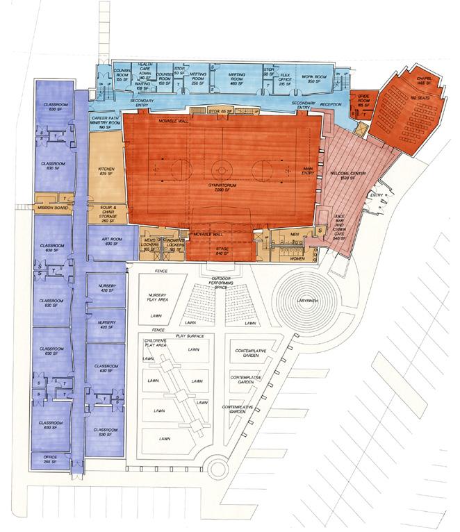 Wrapping an articulately designed courtyard with meditative paths, play-yards, outdoor amphitheater and stage, a 36,000 square foot Christian ministry center provides for education, day-care, assembly and community gathering. The centerpiece is a 7,000 square foot gymnatorium that accommodates athletic events, dramatic productions, worship for 650 and banquets for 500. Its large overhead door allows its dual function stage to serve the outdoor amphitheater.
