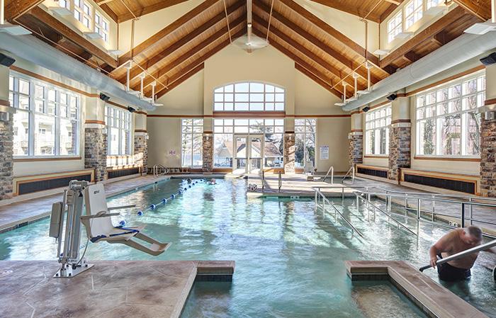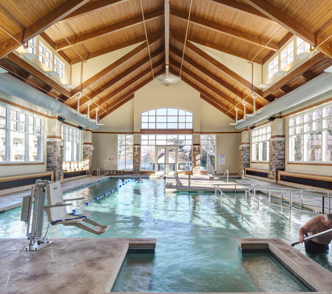 The restaurant and pub form the core of the addition, reconnecting the Lake Terrace Apartments with the life enrichment center. Fireplaces in both spaces adds a touch of warmth. A patio runs along the back of the restaurant and offers an alfresco dining option during warmer months. The wellness center contains a welcoming entry with a beverage center. The focal point of the wellness center is the indoor swimming pool with large windows that provide sweeping views of the lake. Additional amenities include a yoga studio, aerobics room, and weight room.
