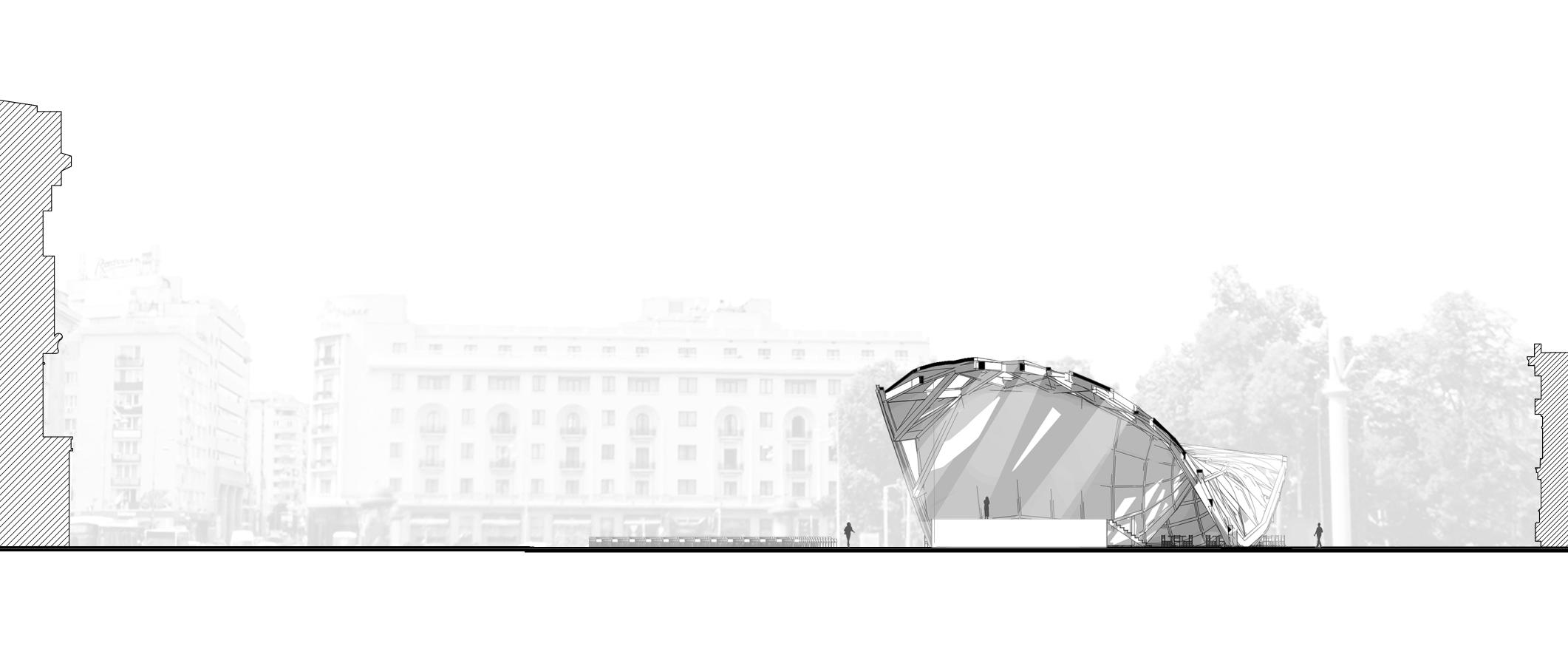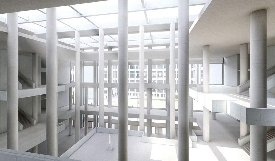 THE POLIVALENT pyramid-shaped hall is a central feature of the proposed cultural center in Bucharest. The hall is designed to be a versatile space that can accommodate a range of events and gatherings, such as exhibitions, concerts, and conferences. One unique aspect of the hall is its squareshaped oculus located above the main stage, which not only provides natural light but also creates a dramatic effect for performances.