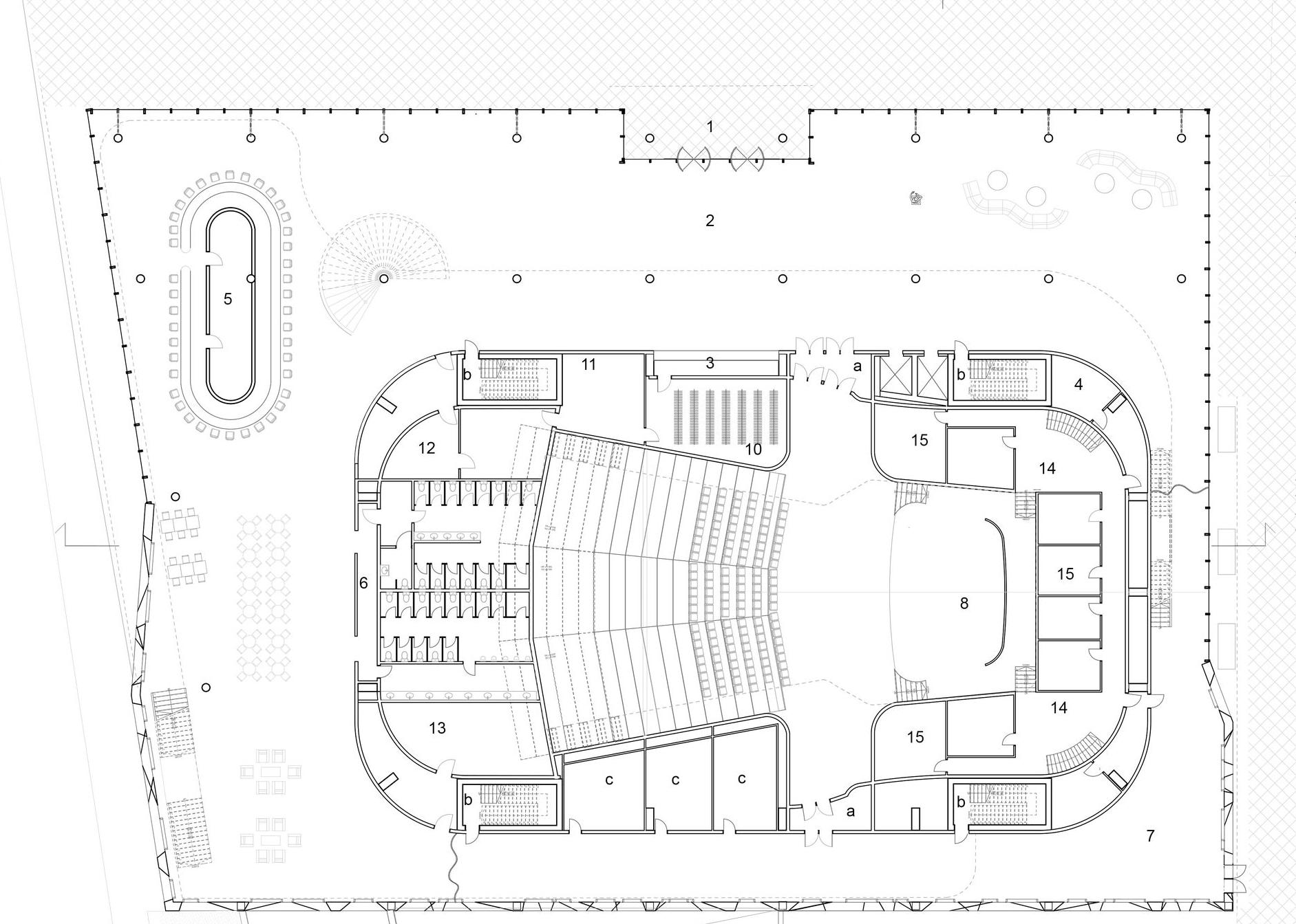 Another notable feature of the hall is its retractable steps, which can be folded back to expand the main area and accommodate larger events. This flexible design ensures that the hall can adapt to the changing needs of the community and provides a dynamic space for cultural activities. The polivalent pyramid-shaped hall serves as a focal point of the cultural center, offering an exciting and innovative space for artistic expression and community engagement.