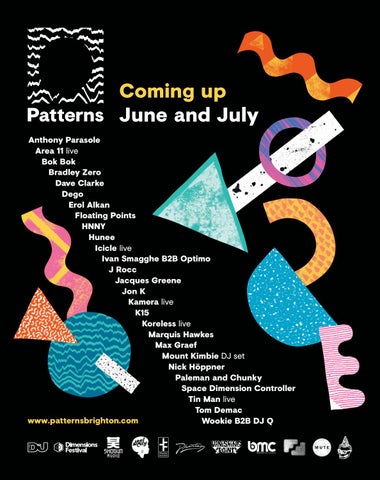 Coming up June and July Anthony Parasole Area 11 live Bok Bok Bradley Zero Dave Clarke Dego Erol Alkan Floating Points HNNY Hunee Icicle live Ivan Smagghe B2B Optimo J Rocc Jacques Greene Jon K Kamera live K15 Koreless live Marquis Hawkes Max Graef Mount Kimbie DJ set Nick Hรถppner Paleman and Chunky Space Dimension Controller Tin Man live Tom Demac www.patternsbrighton.com Wookie B2B DJ Q