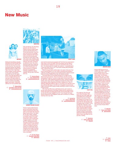 O Cut Me Out 1 Weezer / Elliot Smith : trustfund.bandcamp.com DESERT SOUND COLONY Known to nurture artists from the ground up, Brooklyn-based label Scissor & Thread have some fresh talent on their hands with newcomer Desert Sound Colony. Their debut EP The Way I Began, released on the label run by Francis Harris and Anthony Collins, is a gentle introduction to their enticing style; chugging basslines, soft vocals and rich, cushioned electronics. Throughout the EP’s four tracks its organic, velveteen sounds will win over fans of Caribou’s charming intensity, the melancholic drag of Warpaint and the bright flourishes of early Four Tet. Dreamy pop fluff which is subtle, hypnotic, and at times, truly blissful.