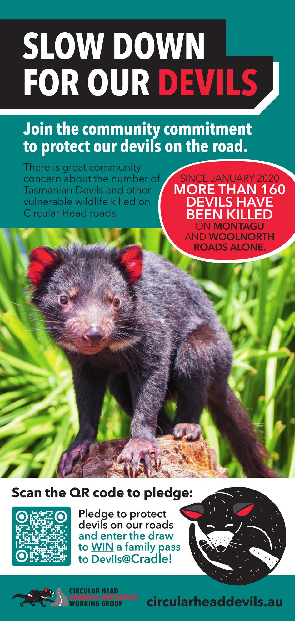 Acommunitypledgehasbeenrolledoutacrosstheregion,askingroad userstomakethecommitmenttoslowdownontheroadstoprotectour wildlife Sofartherehavebeenmorethan230pledgesmade,andyou canjointhecommunitybyscanningtheQRcodeontheflyerorvisiting circularheaddevilsautoalsomakethecommitment Bypledgingtoslow downonourroadsfordevilsyouwillgointothedrawtowinoneofseven familypassestoDevils@Cradleandhavethechancetoseethemup closeonafeedingtour