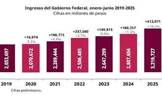 El Servicio de Administración Tributaria (SAT) informa que en el primer semestre de 2025 los ingresos del gobierno federal alcanzaron 3 billones 219 mil 727 millones de pesos, un monto 10.3% superior en términos reales en comparación con el mismo periodo del año anterior; es decir, un crecimiento nominal de 412 mil 71 millones de pesos.