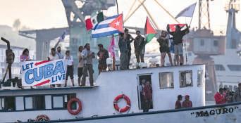 “Let Cuba live” (Dejen vivir a Cuba), se leía en una pancarta que sostenían, mientras desde el muelle otros activistas coreaban: “¡Cuba sí! ¡Bloqueo no!”.