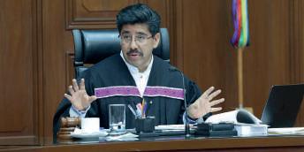 NUEVO INTENTO FALLIDO. La nueva Suprema Corte de Justicia de la Nación (SCJN) negó ayer a TV Azteca y Grupo Elektra aplazar juicios fiscales relativos al cobro de más de 33 mil millones de pesos por parte del Servicio de Administración Tributaria (SAT), por concepto de impuestos. Es la segunda vez en dos semanas que ambas empresas de Ricardo Salinas Pliego, alias ‘Tío Richie’, buscan frenar las resoluciones de la Corte. En la imagen, Hugo Aguilar, ministro presidente.