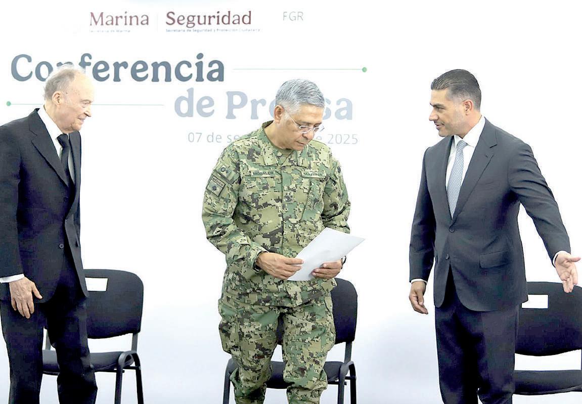 De izquierda a derecha, el fiscal General de la República, Alejandro Gertz Manero; el secretario de Marina, Raymundo Morales Ángeles, y el secretario de Seguridad, Omar García Harfuch, se retiran de la conferencia de prensa, ayer, en la que se dieron detalles de la investigación y acciones que llevaron a detener a 14 integrantes de una red que traficaba “huachicol fiscal”. Pág. 4