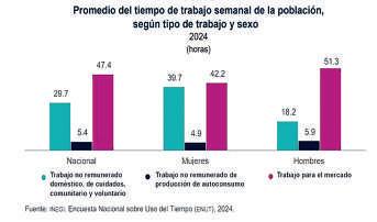 La ENUT reveló que en tanto el promedio semanal del tiempo total de trabajo de la población de 12 años y más fue de 59.6 horas. Sin embargo, las mujeres trabajaron 61.1 horas; mientras que los hombres, 58.0, lo que indica que
