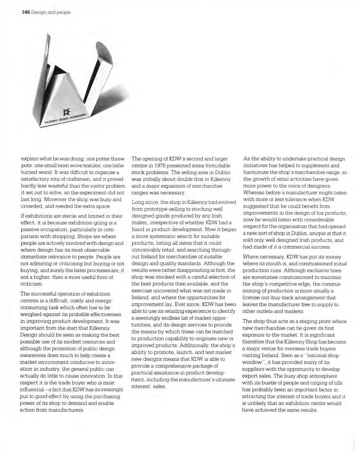 commercial undertakings. They give shelf space to promote and prime the market for new products. This includes craft products where the Kilkenny Shops act as a valuable proving ground for crafts people. It also includes industrially produced consumer products such as furniture where the ability to sell through the Kilkenny Shops and the ability of KDW to also wholesale abroad has been a powerful incentive for Ireland's manufacturers. Some government grant assistance is required for the shop to undertake these product development roles but it is an extremely efficient means of assisting industry and craftspeople. It is to be hoped that the value of this unique initiative will be understood in the future and the essence of the Kilkenny Shops preserved in a non-commercial context.