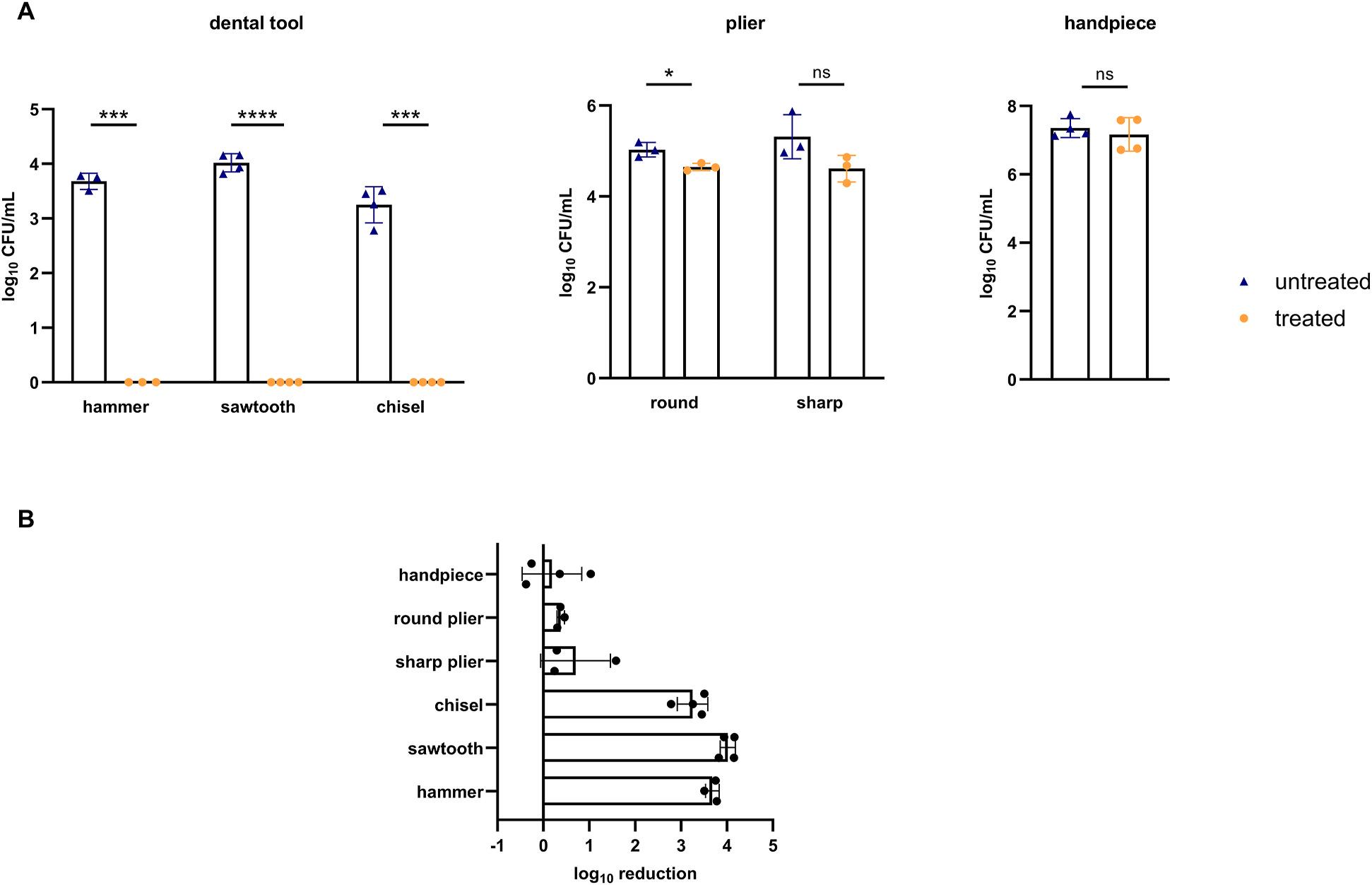 Fig. 2. Bacterial load and log reduction factors of non-rinsed medical instruments. Dots represent individual data points. Bar charts are shown as mean ± standard deviation (SD). (A) Log-transformed colony forming units (CFU)/mL of S. aureus under control and treatment conditions collected from dental tools (n = 6) (6 independent experiments), round and sharp ended orthodontic pliers (n = 3) (3 independent experiments), handpieces (n = 4) (2 independent experiments), and thermistor (n = 4) (2 independent experiments). * (p < 0.05), **p < 0.01), *** (p < 0.001), **** (p < 0.0001), ns (non-significant) (paired t-test except for data on sharp ended plier and sawtooth, Wilcoxon matched-pairs signed rank test) (B) Log10 reduction factors for the different medical instruments.