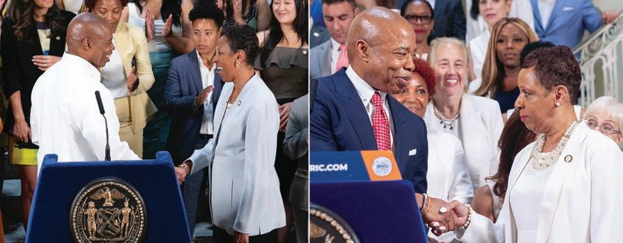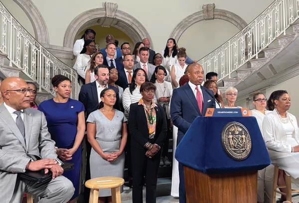 MAYOR ERIC ADAMS with council members (from left) Diana Ayala, Sandy Nurse, Bob Holden, Speaker Adrienne Adams, Shahana Hanif and Justin Brannan.
