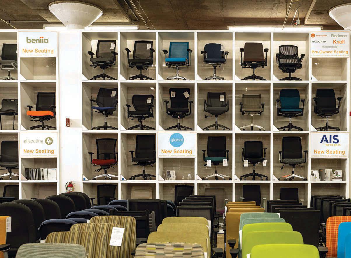 As companies continue to downsize their o ce space in the post-pandemic era, furniture is pouring out of downtown high-rises and suburban o ce parks. Facilitating the transition are used furniture dealers who earn money breaking down or decommissioning o ces. e companies giving up space can earn a credit for valuable