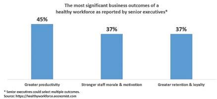 According to the Economist Intelligence report1, commissioned by Cigna, 45% of senior executives attribute a healthy workforce to greater productivity, 37% of them say a healthy workforce leads to stronger employee morale and motivation and 37% of senior execs say a healthy workforce results in greater retention and loyalty.*