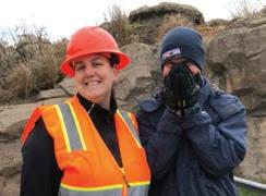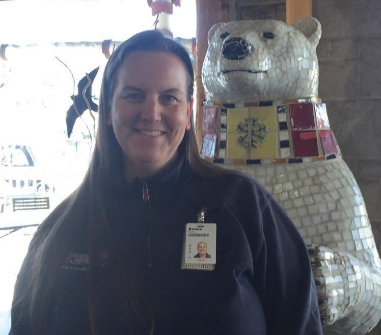 Betsie Meister was a cherished and dedicated DZS team member for 24 years. Below right: Meister poses in construction gear outside the Arctic Ring of Life habitat with a fellow DZS team member. Bottom right: She takes part in a project to observe wild bears in Alaska. Bottom left: Meister (far left) poses with members of the DZS team at the 2024 employee appreciation picnic.