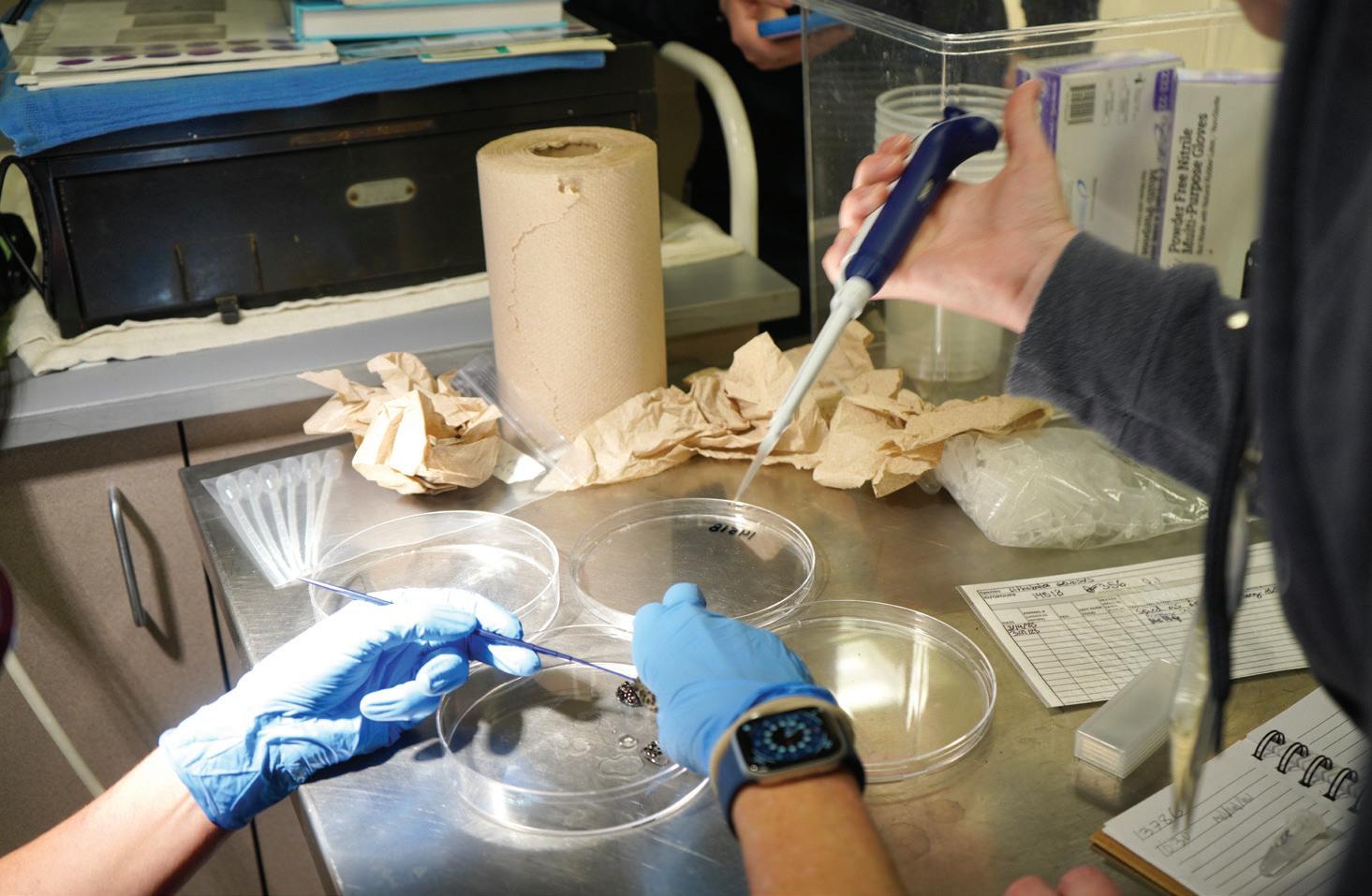 The female is gently tickled with a special tool, and she responds by laying eggs. Next, the males are prepared in a similar way — they receive hormone injections and are tickled to collect male reproductive cells. These cells are studied under a microscope to determine their health, and the best of the best are then cascaded over the female eggs.