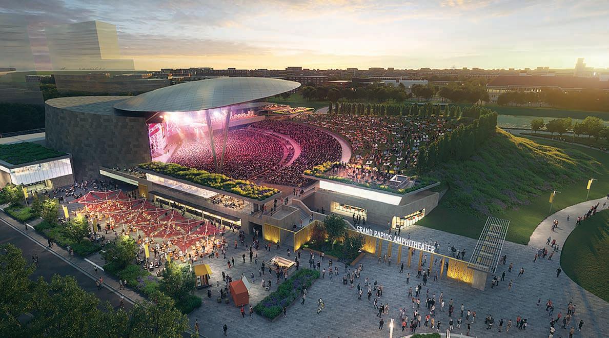 A 12,000-capacity amphitheater planned along the Grand River in downtown Grand Rapids is slated for a spring 2024 groundbreaking that would conclude by the 2026 season.