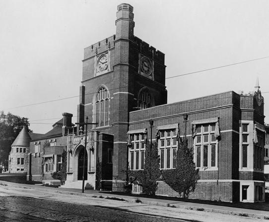 The ready room includes a large window with Gothic tracery. The new 95-foot tower includes a 23-bell carillon. Work on the existing building included adding insulation to the roof, installing new slate roofing and cleaning the existing masonry. The original wood doors had been replaced with aluminum doors that were out of character with the building. New doors were crafted that restored the original appearance of the building.