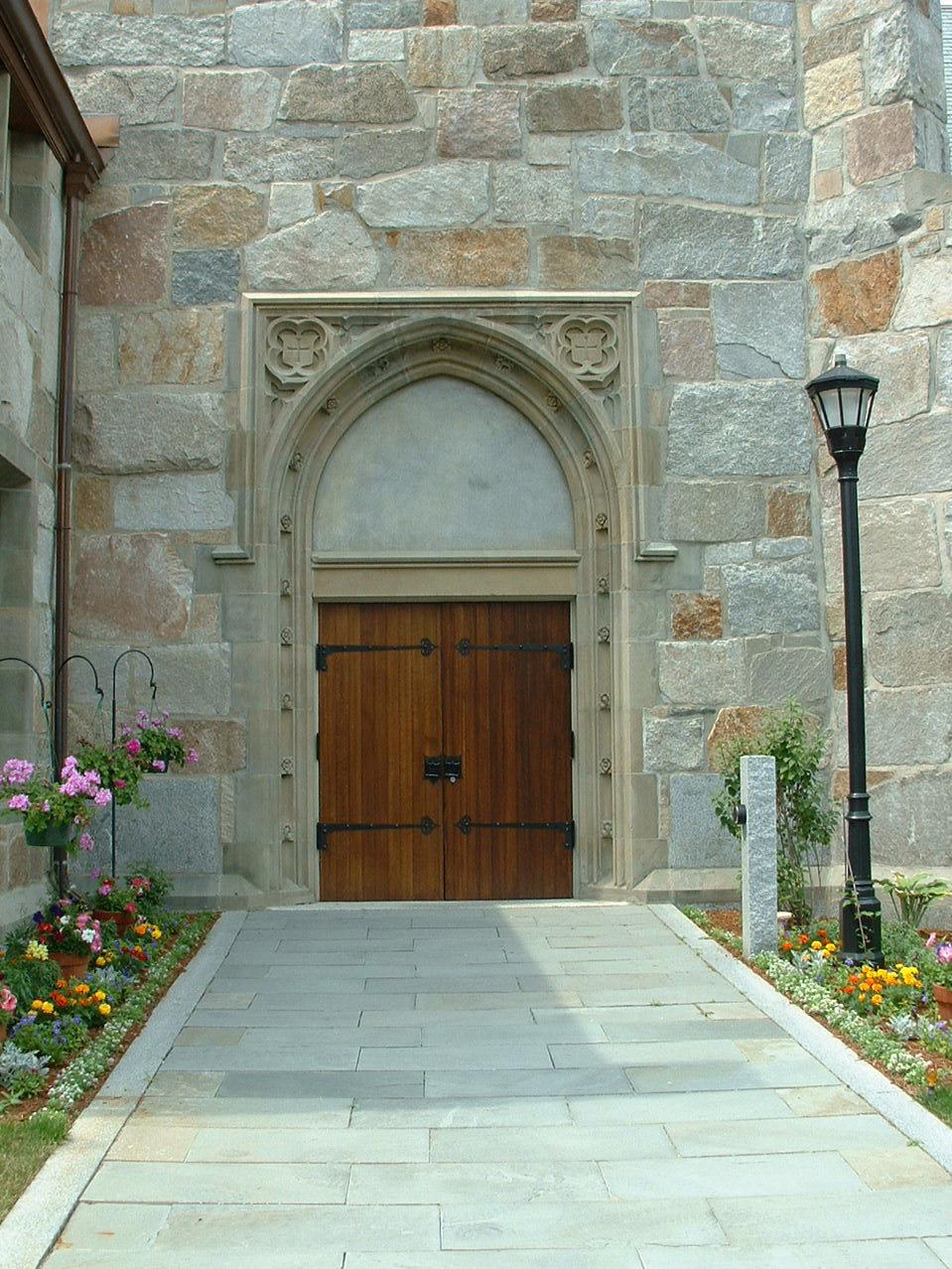 All Saints’ is a single aisle church and the choir enters through the door adjacent to the Sacristy, a small room on the North side of the Church. The door is located under the junction of several roof valleys. Summer rain and winter ice build up made the use of the door difficult. The problem was to design a structure that would be compatible with the existing building and built of the same materials to deflect the rainwater and ice that created a slipping hazard.