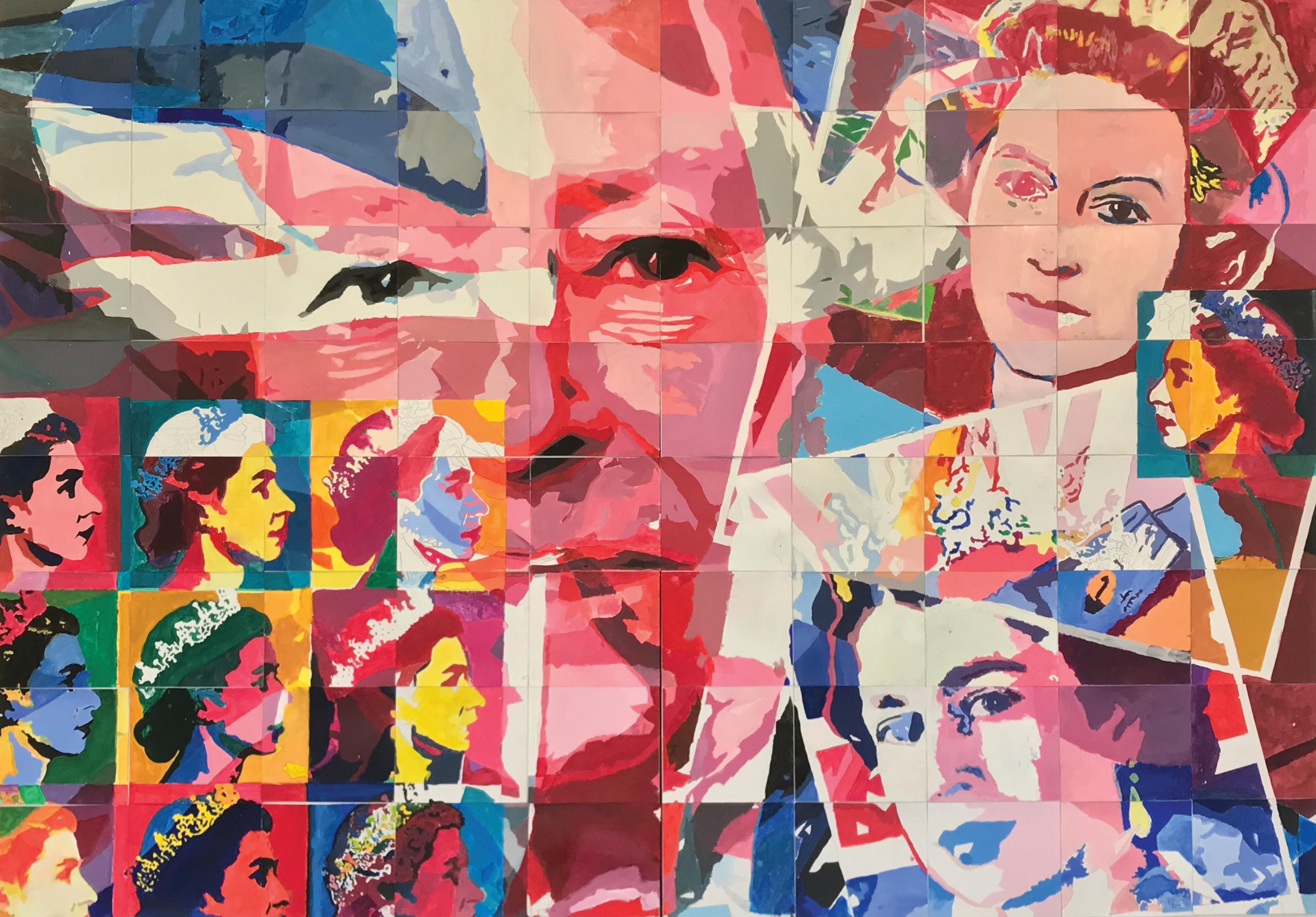 Form 5 worked as a team over five weeks to produce a group portrait of ‘Her Majesty’ to celebrate her Jubilee next year. The image is made up of a compilation of wellknown Pop Art pieces by Warhol and some photoshopped overlays.
