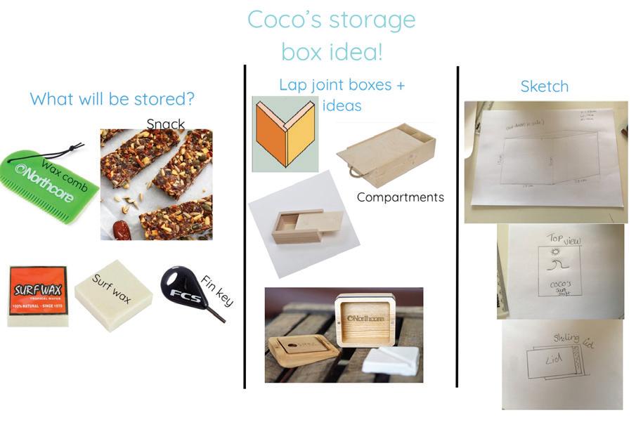 methods were available. They then created ideas through sketches to communicate their thoughts. Consideration of sizes and objects to be stored were critical to the success of the overall design of the Lap Joint Box and its production!