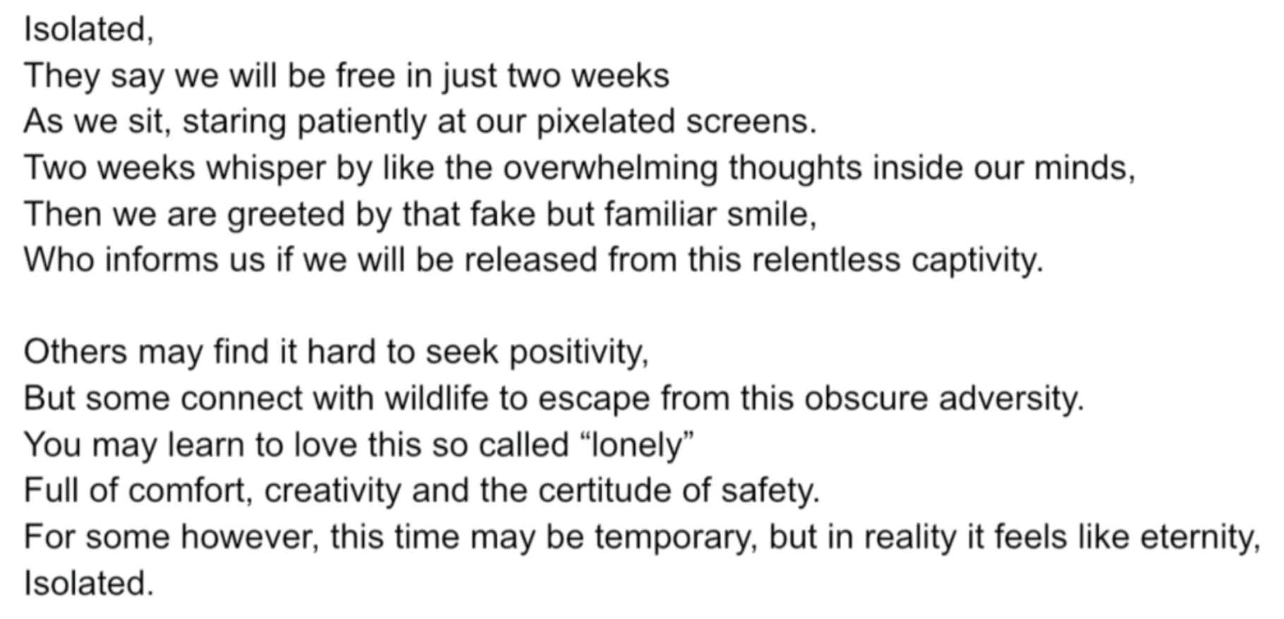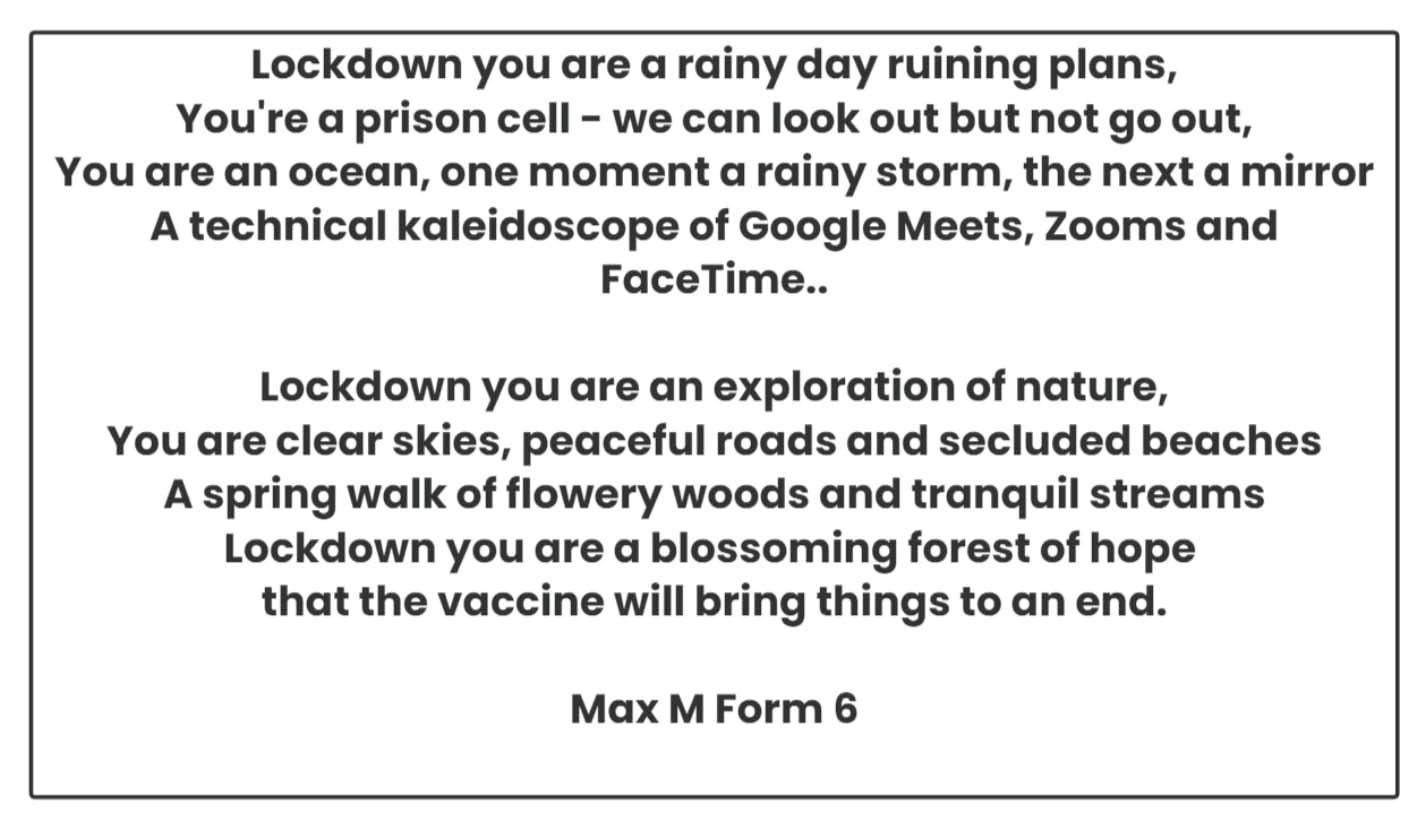 Pupils all contributed to the Cranleigh Prep poetry anthology called Looking In and Looking Out: Cranleigh Prep in Lockdown 2020-2021.
