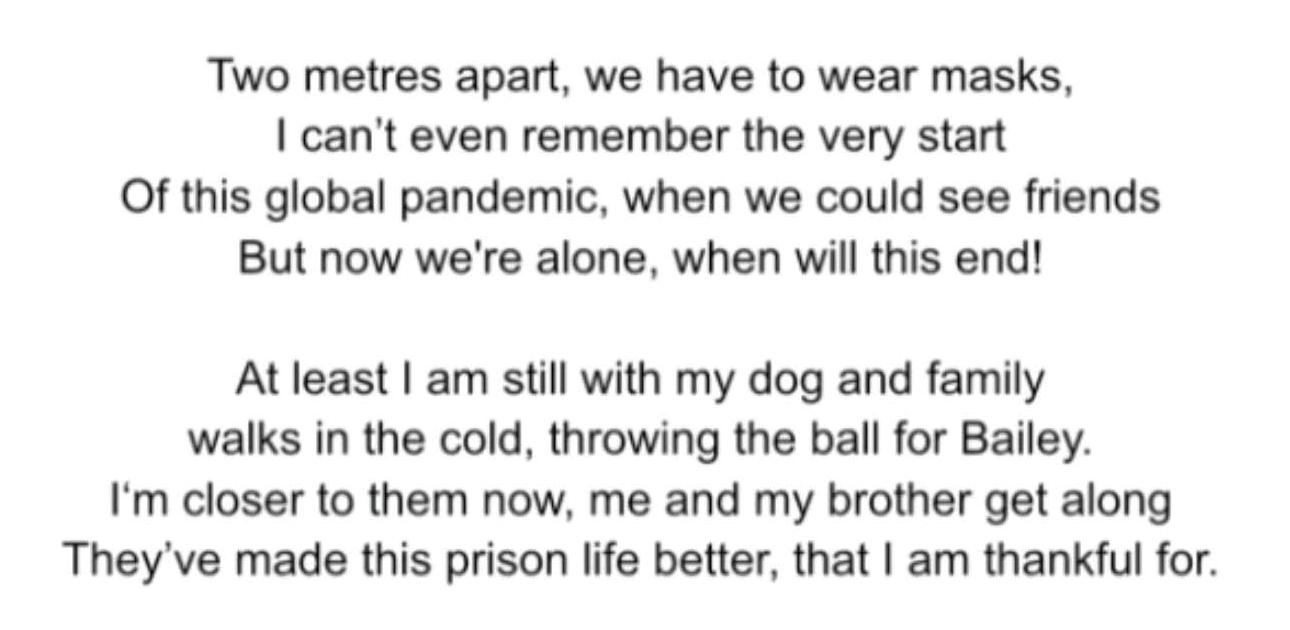 This virus locks you up, And restricts you, controls where you go. It takes loved ones to the place nobody knows about. Some people call it the living hell.