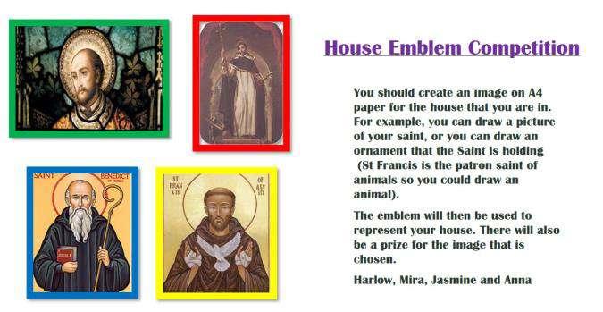 The first competition is to design a house emblem for each house. Entries must be on an A4 pieces of paper, should include either an image of the saint or an item that you might associate with him and images should reflect the house colour. Entries need to be brought into school by the end of term.