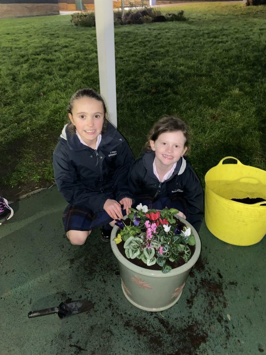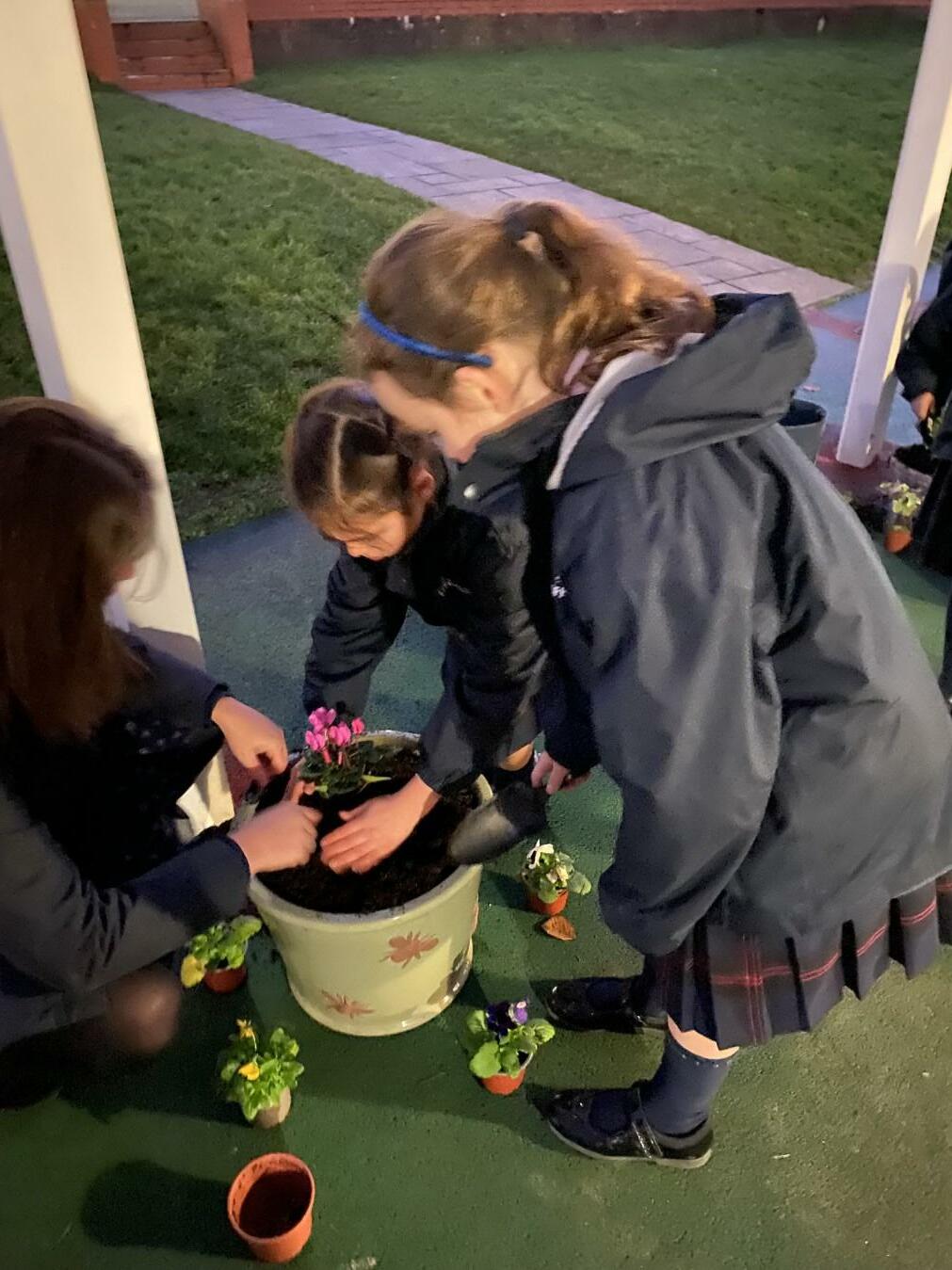 Eco and Gardening Club had fun planting some new pots and hanging baskets for around the school today. They planted cyclamen, pansies and hanging ivy too. After choosing the plants they wanted for their pots, they used trowels to create holes for each plant, wriggled the plant out of its pot and planted it. The girls were amazing at tidying up too. A huge thank you to Alan, the gardener, for preparing all the pots and buying the plants for us too.