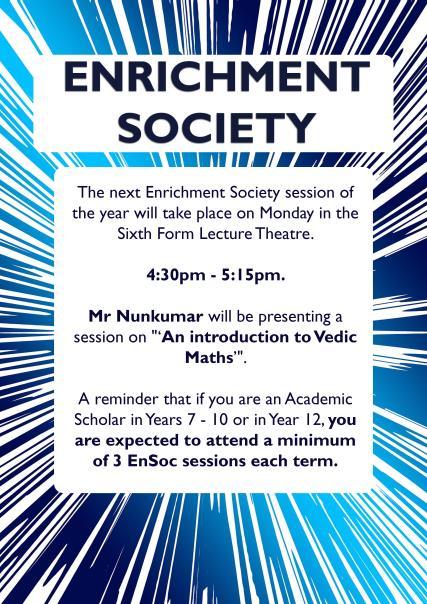 We expect you to attend two sessions per half term to make the most of this enrichment opportunity. A packed lunch will be provided so do complete the spreadsheet when you put your name down. The next date for this half term is the 8th December 13:30 14:10 in room 35.