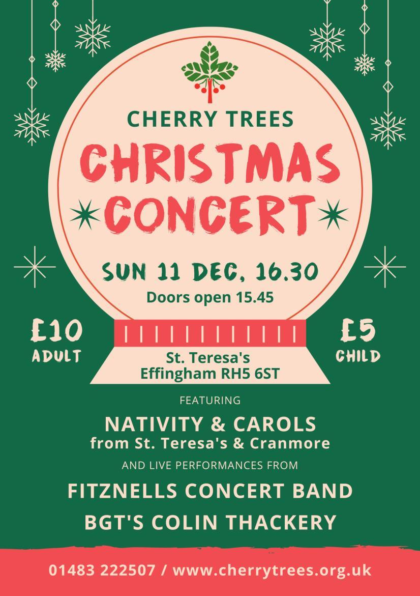 Join us at our Cherry Trees Christmas Concert in the atmospheric Mairlot Hall at St Teresa's in Effingham on Sunday 11 December. Doors open at 15.45 with the performance from 16.30. Expect a festive afternoon of fun filled, family entertainment including: Nativity & Carols from pupils at St Teresa's & Cranmore. A rousing medley of Film Favourites & Christmas Classics from Fitznells Concert Band. Special performance from Britain's Got Talent winner, Colin Thackery. Bring friends and family to this wonderful afternoon of Christmas magic with all proceeds supporting Cherry Trees and the children and families that rely on our support. Get your tickets here: https://www.cherrytrees.org.uk/Event/christmas concert
