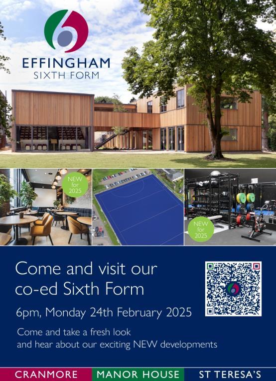 Please see the invitation to our next Effingham Sixth Form Open Evening, for those currently inYear 10, to be held on Monday 24th February 2025 from 6pm to 7.30pm.