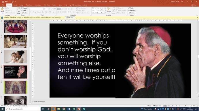 Last Sunday the Church marked the end of the liturgical year with the feast of Christ the King. In this final week of the year we are asked to reflect on: Who or what do we worship? Who or what do we give the greatest priority to in our lives? And where or how does that worship manifest itself in our lives?