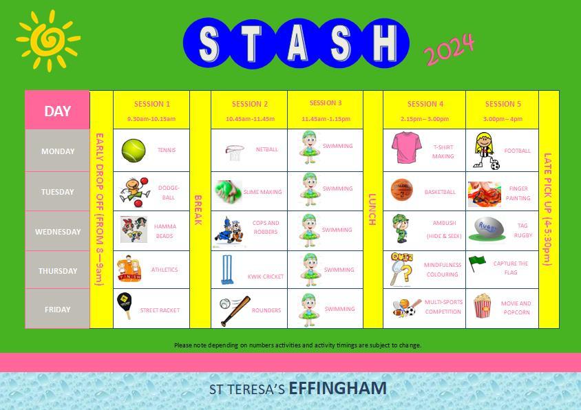 Monday 8th - Friday 12th July , £45.00 per day or £200 per week. If you would like your daughter to attend STASH this summer (Monday 8th - Friday 12th July), please could we ask you to complete this form.