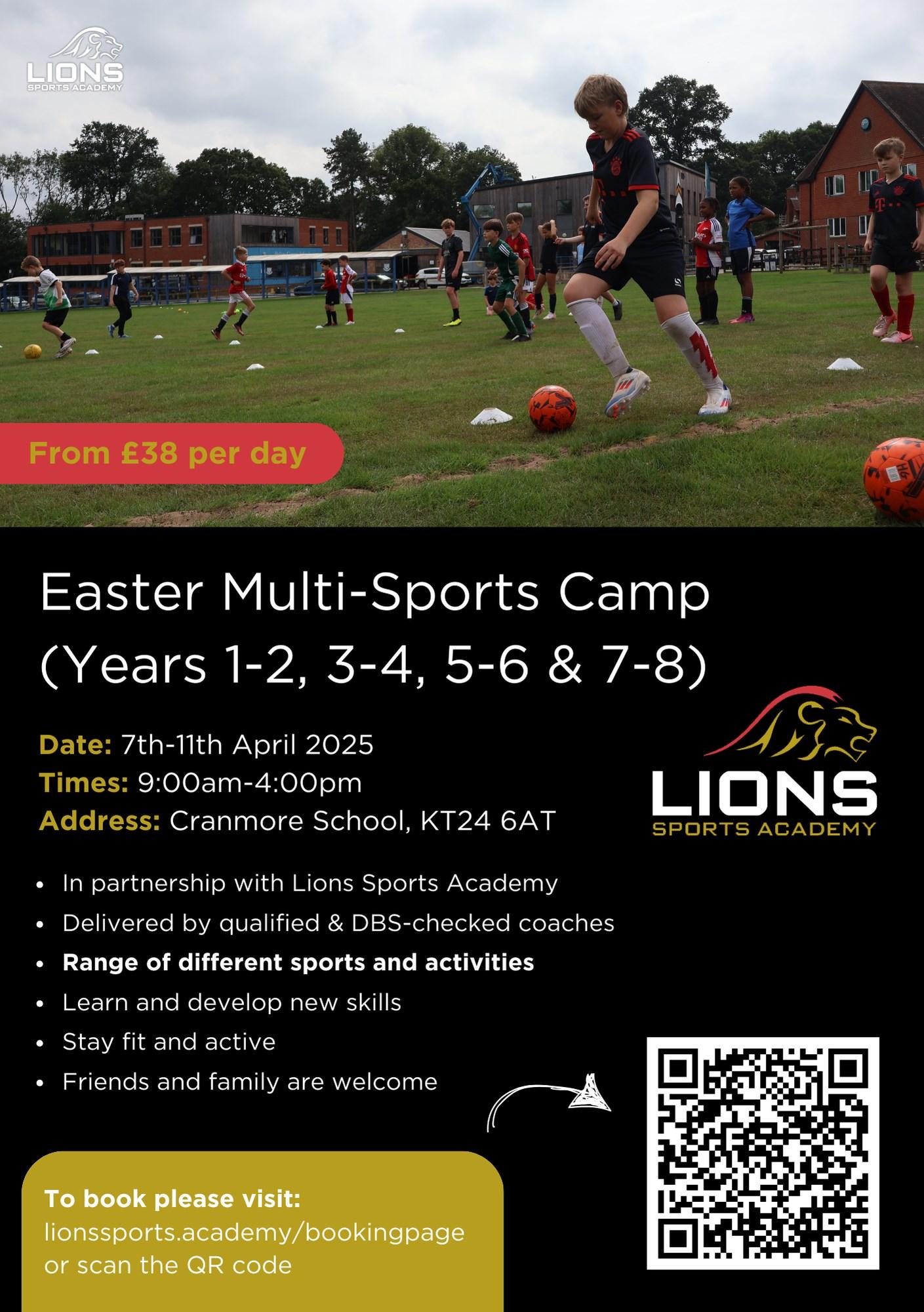 Lions Sports Academy are running a camp this Easter at Cranmore. Please see flyer and use the link below for more information: https://www.lionssports.academy/bookingpage