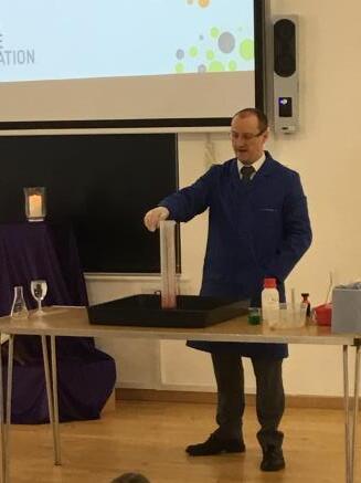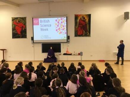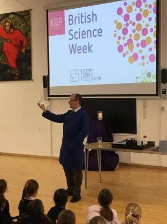 On Tuesday, Mr Stephens from the Senior School came to show us some science magic in honour of British Science Week. The girls particularly enjoyed the 'Elephant Toothpaste', a mixture that glowed luminous blue and watching Mr Stephens turn water into wine!