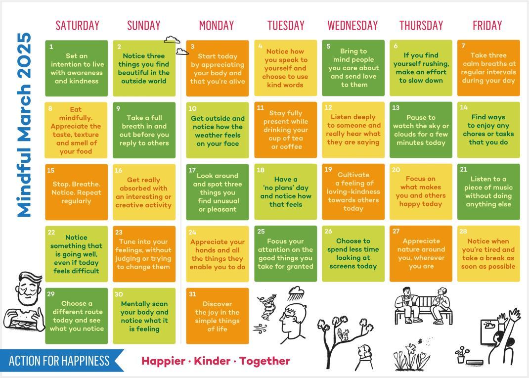 And on that note, in glorious sunshine (as I write), we launch into Mindful March – see new Action For Happiness calendar below, where our first challenge is to ‘Set in intention to live with awareness and kindness’.
