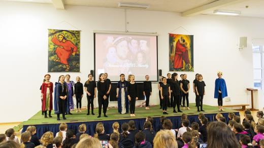 This Wednesday, we were treated to a trip back in time to the reign of the Tudors, courtesy of 5KH. They entertained us with humorous songs and sketches about all the Tudor monarchs and Henry VIII's six wives, as well as playing 'Greensleeves' on their ukuleles. We also discovered what Tudor schools were like and the games they played, and the girls tested our brains with their clever riddles.
