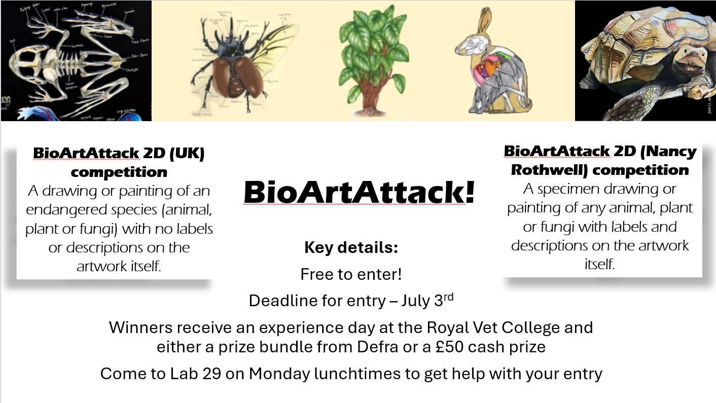 Over the next few weeks, the Biology Department will be supporting students who want to enter the national BioArtAttack Competitions.To enter, you need to submit either: a) a drawing or painting of any endangered species with no labels, or b) a specimen drawing of any animal, plant or fungi with detailed biological labels.