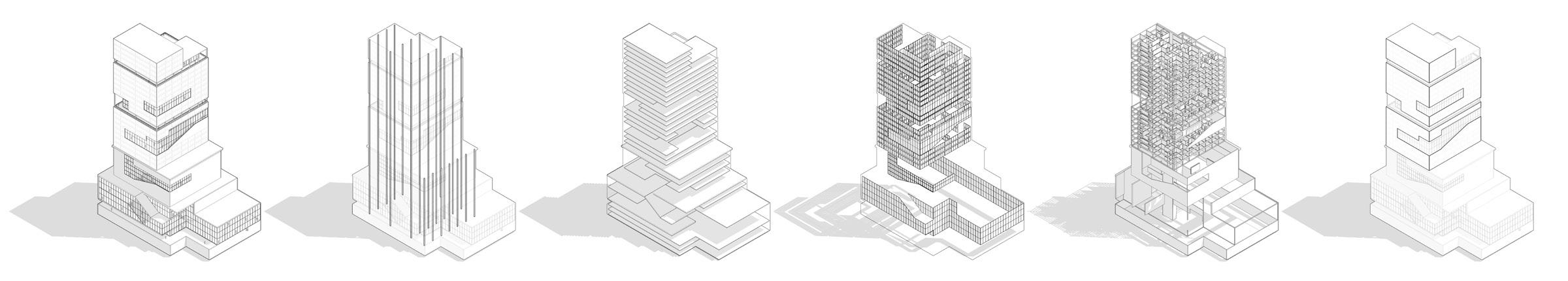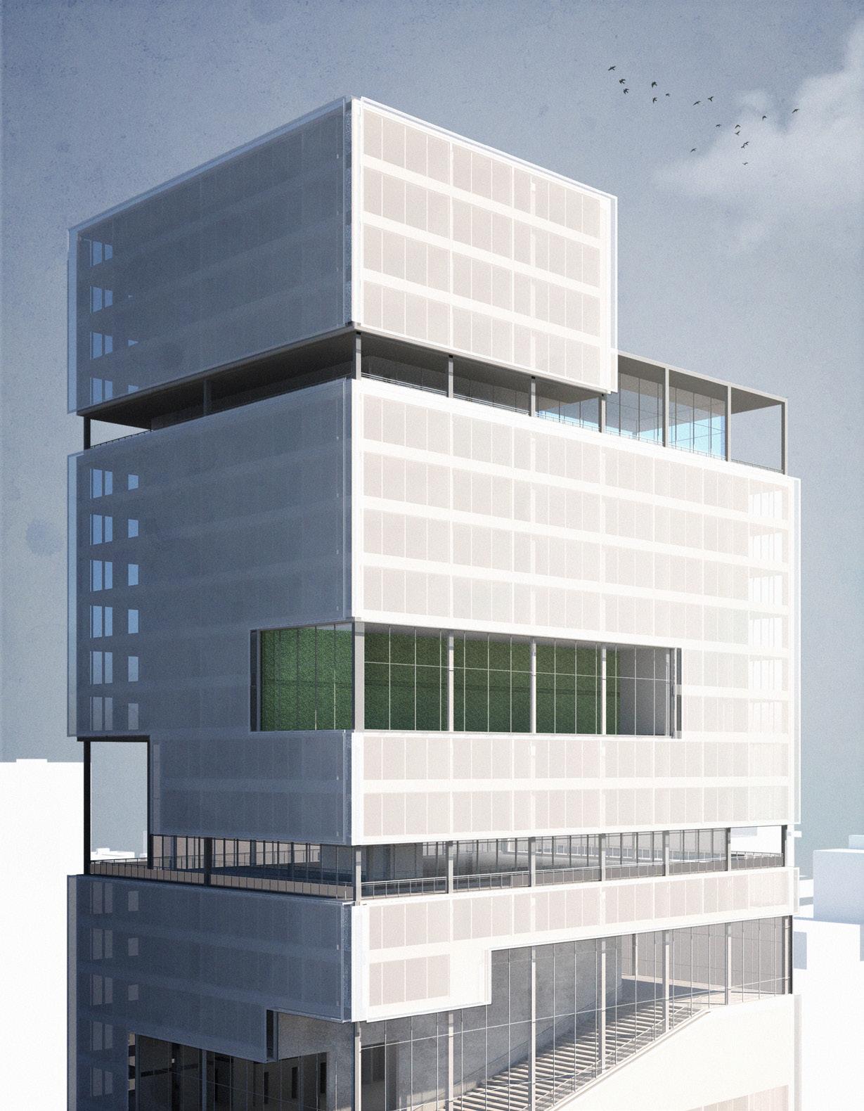 The tower, designed in a gentrified area, chooses to give back to the existing community. Public circulation is scattered throughout the building and is left visible to the exterior without a sun shading device. This highlight of the public space allows for the experiences within them to be broadcasted to the outside.