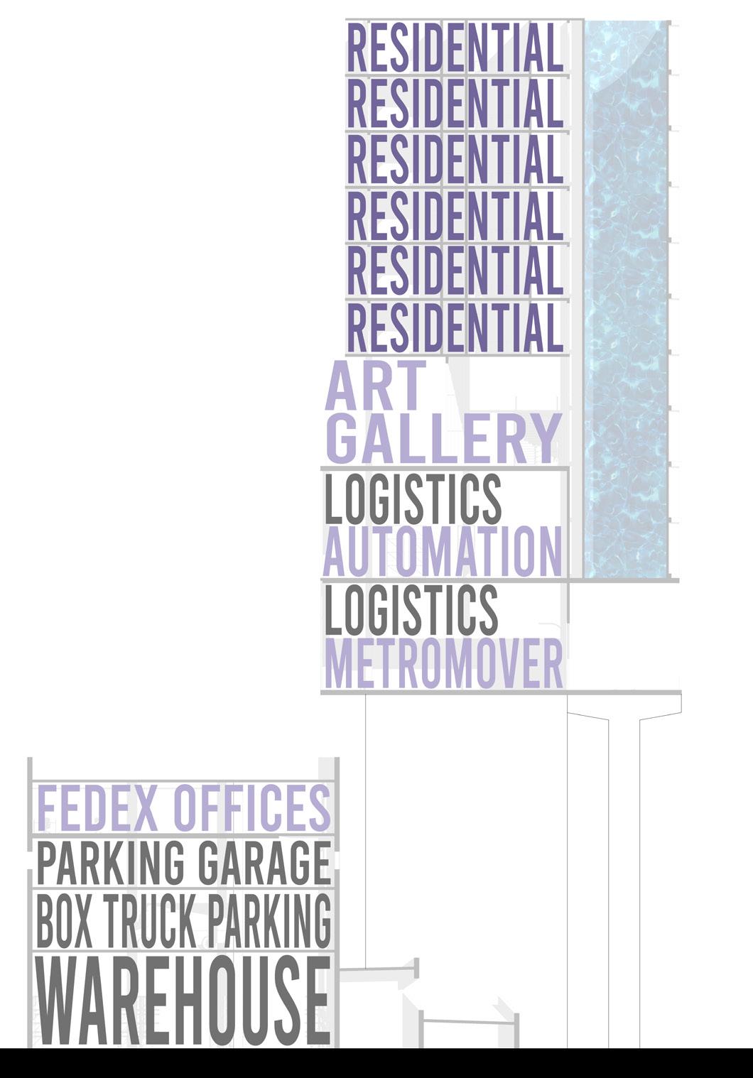 Delivery-service companies, such as Amazon, have become the forefront of consumerism in America. In this context, the current FedEx center in downtown Miami can only be expected to grow further as business expands and new modes of logistics are deployed. Access to the interstate highway and downtown road networks currently drive the system; However, in the future, it should be possible to tie the building into the Metromover rail network. Drones will also likely drive the next generation of delivery systems; meanwhile, access to logistics make vertical farming attractive, capitalizing on the infrastructure of mobility.