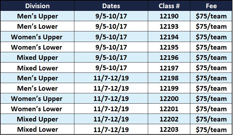 Matches start at 6:15pm on Tuesday evenings. 6 matches with a single elimination tournament.