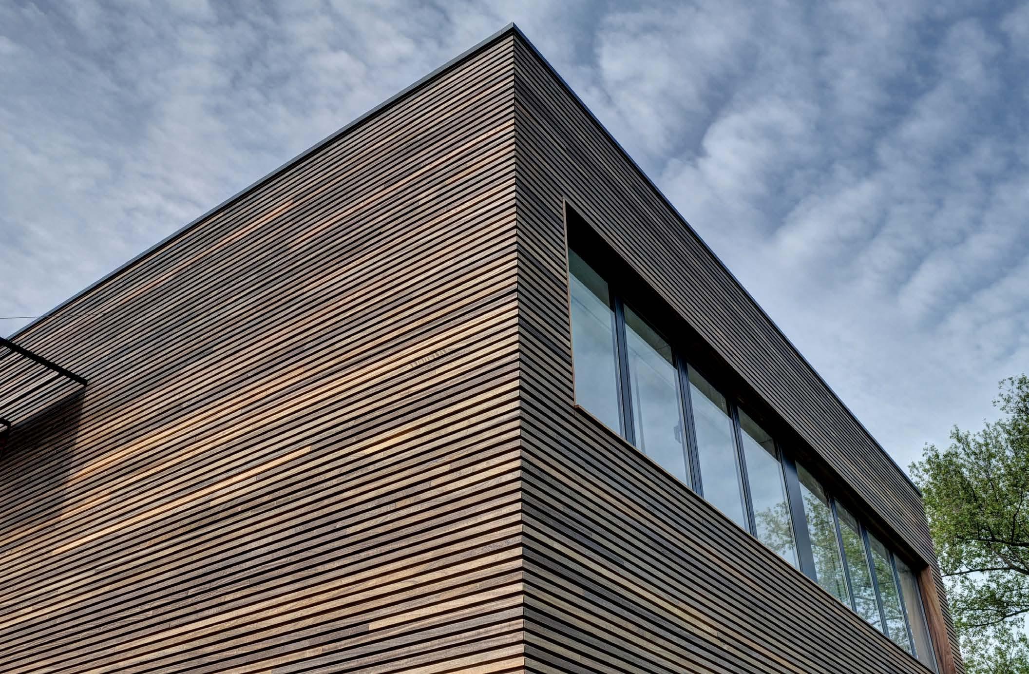H et hout (voornamelijk den) ondergaat een 100% natuurlijke warmtebehandeling van 180-220°C. Het vochtgehalte daalt waardoor het hout vormstabiel en duurzaam wordt, vergelijkbaar met tropisch hardhout. Thermowood is zeer ecologisch. De kleur van het natuurlijke hout wordt donkerder. Het hars is uit het hout verwijderd. De thermische behandeling is niet in eigen beheer.