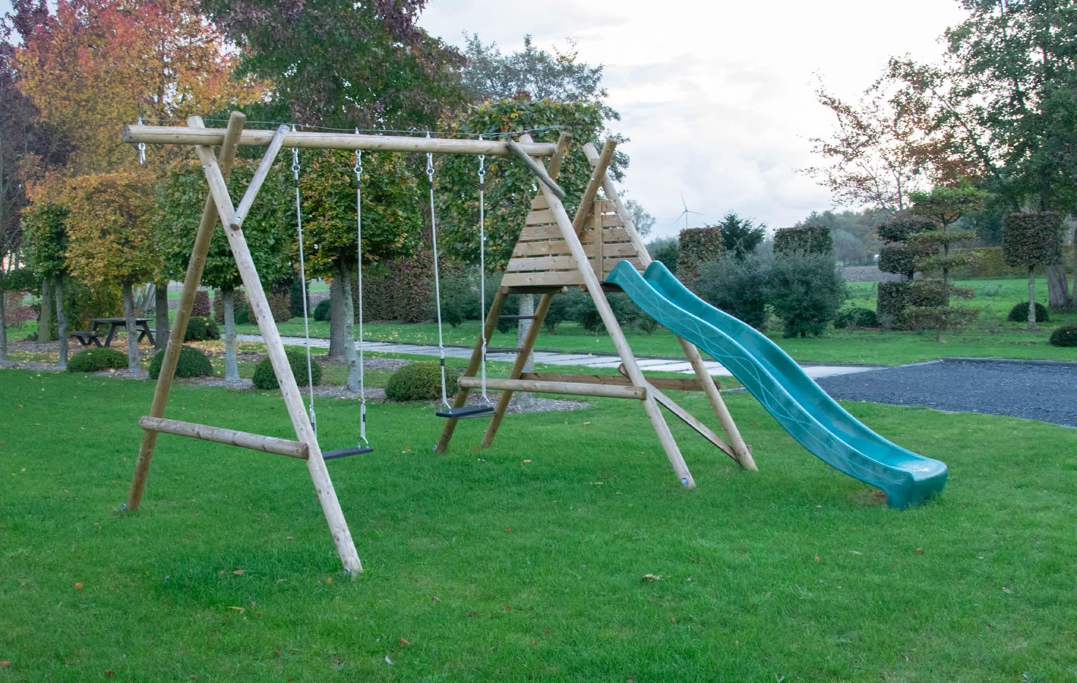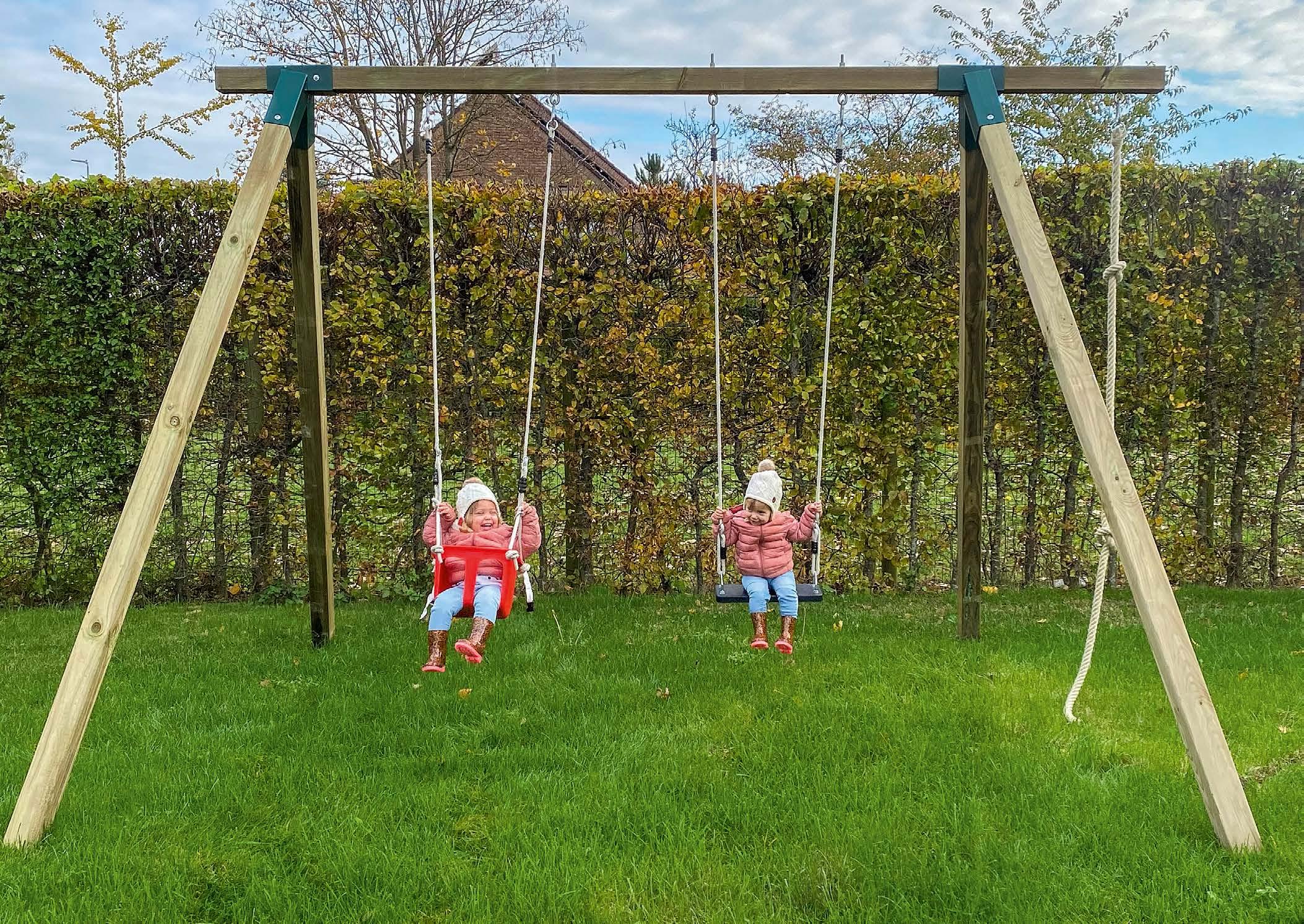 Schommelhaken en glijbaan zijn altijd inbegrepen. Je kan wel nog extra toebehoren kiezen zoals een zitting, trapeze, ringen, ... 24