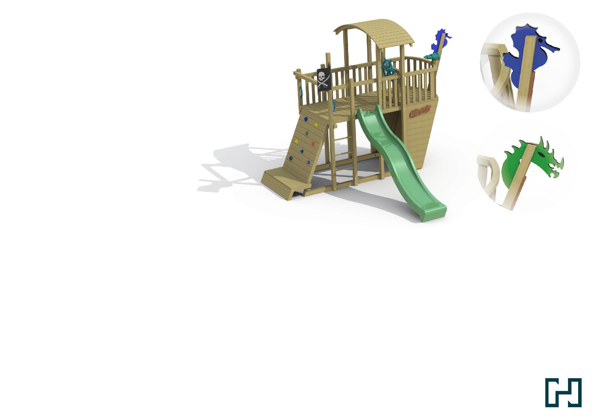 • Een aanbouwschommel (0501, 0502, 0516) en 4 grondankers zijn niet inbegrepen maar wel verplicht aan te schaffen bij het speeltoestel omwille van veiligheidsredenen en stabiliteit.