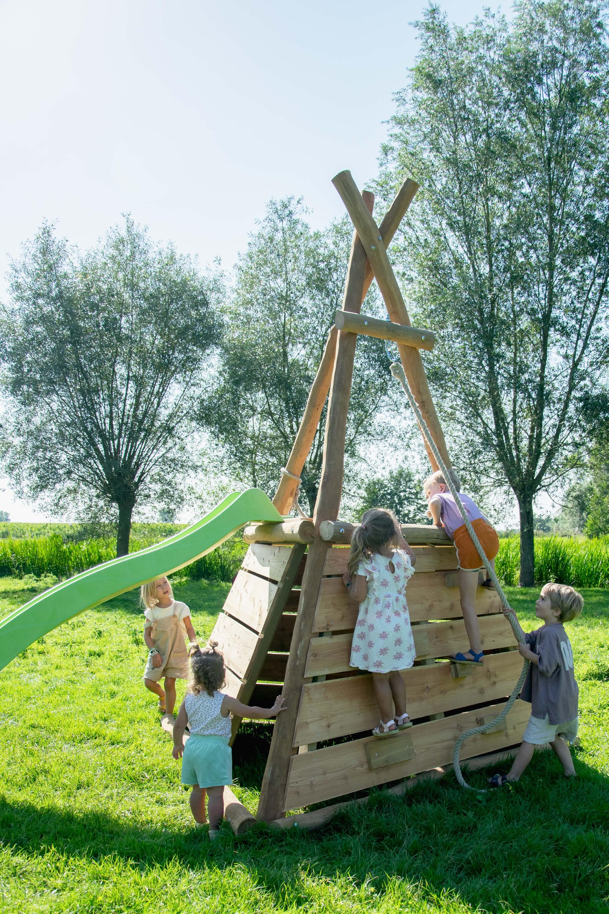 Het platform met glijbaan, de klimmuur en het klimnet moeten omwille van de stabiliteit altijd met een aanbouwschommel combineerd worden.