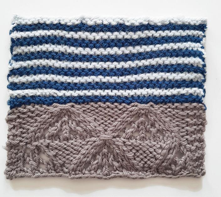 Para un montaje decorativo con 2 colores; toma una hebra de cada color y haz un nudo deslizado con ambas hebras juntas (este nudo se descarta al final). Usa cada hebra para hacer tu montaje de dos hebras favorito. Luego, teje con la hebra principal y deja una hebra larga del segundo color para esconderla más tarde. Esto le dará un toque personal a tus tejidos y evitará que te falte hilado al montar los puntos.