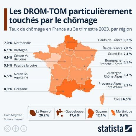Observe l’infographie suivante et commente-la en généralisant les chiffres. Compare les chiffres du chômage en France avec ceux des DROM-COM.