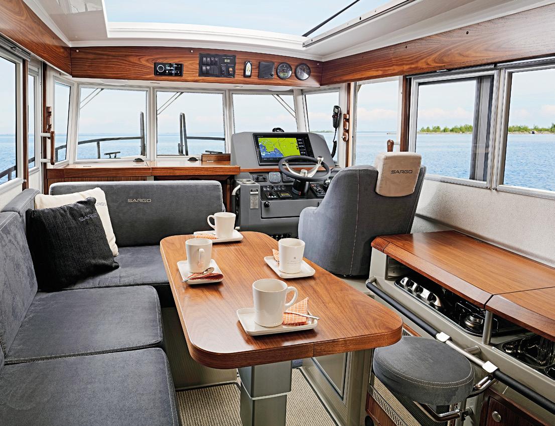 Markkinoiden leveimmät yksitasoiset sivukannet tuovat liikkumisen turvallisuutta veneen ulkotiloihin. Ohjaamon kohdalla oleva käytännöllinen runkoportti tekee veneeseen noususta turvallista. Perä- ja keulakannella on yhteensä kaksi erillistä istuinryhmää ja tilava aurinkovuode. Lisäksi SARGO 45:n istuintyynyt, pöydän ja lepuuttajat saa pakattua kätevästi niille varattuihin fiksuihin säilytyslokeroihin. Jokaisen yksityiskohdan ovat suunnitelleet ihmiset, jotka ovat itse aktiivisia veneilijäitä ja joilla on alalta yli 50 vuoden kokemus. Tilava ohjaamohytti tarjoaa neljä istumapaikkaa rivissä, ergonomisesti suunnitellun ohjaamon ja vapaan näkyvyyden joka suuntaan. Avaamalla suuren sähkötoimisen kattoluukun ja sivuovet on myös mahdollista kokea avonainen tunnelma, johon monet veneilijät ovat tottuneet. Lisäksi tilasta löytyy kahdeksan hengen U-sohva ja reilun kokoinen pentteri. Lisävarusteina veneeseen saa astianpesukoneen, keskuspölynimurin ja jopa pesukoneen. Kaikelle on oma paikkansa, ja laatikoissa on valmiina posliinilautaset, lasit ja ruokailuvälineet. Kannen alla on valinnan mukana joko kaksi tai kolme makuukajuuttaa. Kaikki kajuutat ovat hyvin varusteltuja ja niissä on riittävä seisomakorkeus. Kaksi erillistä toilettia tekevät veneessä oleskelusta mukavampaa.