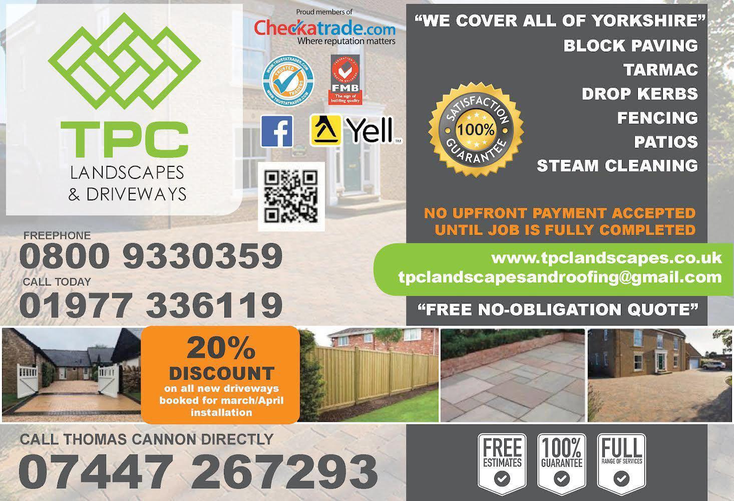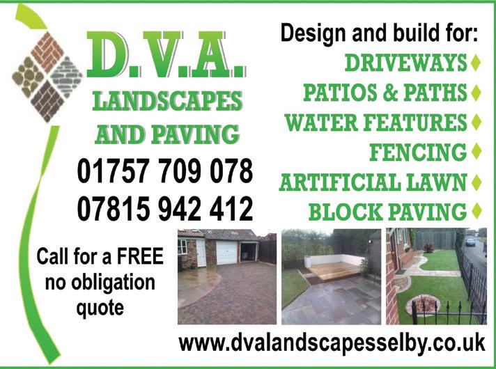 Page 6 Please mention Selby Journal when calling advertisers To advertise contact our sales team on 01757 681380 on all new driveways booked for July/August installation SELBY 01757 600412 WWW.AERIALSERVICESYORKSHIRE.CO.UK Fully insured NPTC trained and qualified All aspects of tree work Hedge Cutting Pruning Stump Grinding Arborist - Tree Surgeon Paul Clifton: 07545 393394 01757 713072