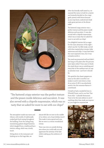 After the friendly staff seated us, we scanned the menu to look for a starter and instantly decided on the crispy garlic prawns with lemon because as you may know, seafood and steak make great partners at the dinner table! The battered crispy exterior was a perfect texture and the prawn inside delicious and succulent. It was also served with a chipotle mayonnaise, which was so tasty that we asked for more to eat with our chips! Our delightful starters left us eager for the main attraction of the night which was the 7oz fillet steak, served with slow-roasted plum tomato, baby watercress and chips. It may have been the most expensive item, but it was certainly worth it. The meal was presented well and didn’t last long on the plate after the pictures were taken either! From start to finish the steak dinner was so satisfying and every bite of the medium-rare cut was an absolute treat - just how it should be. We opted for the classic peppercorn sauce as the side to smother our steaks in and it went down a treat. At an extra £1.89 it was absolutely worth it for the immense flavour it contributed. Overall we had a wonderful time in Whinfell Forest, and in our first ‘Star From Afar’ - Lakeside Restaurant. Tune in for the next edition to see if anything other than steak can impress us, you might be surprised. u